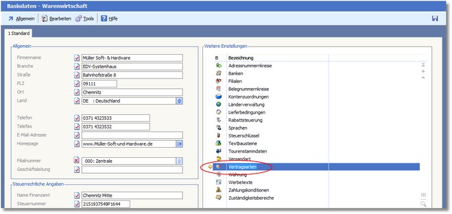 2. Im Bereich "Weitere Einstellungen" doppelklicken Sie nun auf den Eintrag "Vertragsarten".