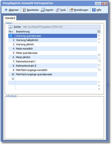 Das Programm öffnet die vorgelagerte Auswahltabelle der Vertragsarten.