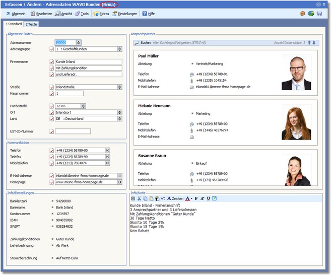 In der nachfolgenden Abbildung sehen Sie den zentralen Bearbeitungsdialog für einen Kunden, der als Firmenkunde (in der Titelleiste ersichtlich) angelegt wurde. Hier werden allgemeine Kundendaten und Ansprechpartner verwaltet sowie spezielle Einstellungen (z.B. Lieferadressen, Zahlungskonditionen, Skonto, Rabatt, Vertreter etc.) für den Kunden festgelegt. |