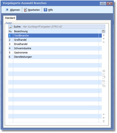 Das Programm öffnet die vorgelagerte Auswahltabelle der Vertriebsgebiete.
