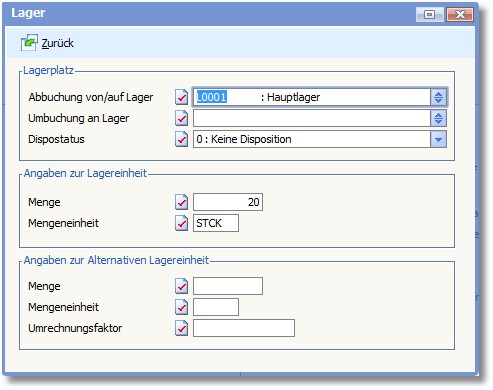 In diesem Feld wird der Faktor eingetragen, mit dem die Menge der alternativen Lagereinheit umgerechnet werden soll.