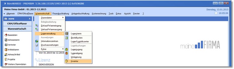 1. Zum Starten der Inventur klicken Sie auf den Menüpunkt "Warenwirtschaft > Lagerverwaltung > Inventur“.