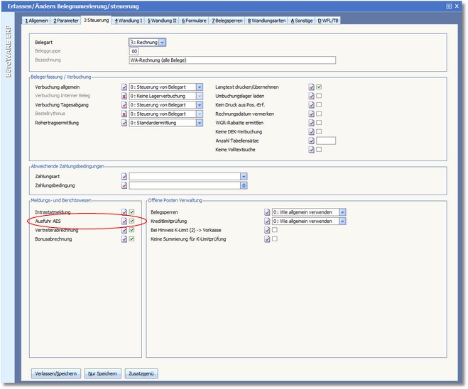 Damit Belege und Artikelpositionen für die Zollabwicklung exportiert werden können, muss die Beleggruppe (WA-R und WA-L sind möglich) als AES-exportfähig gekennzeichnet sein (DBK30_1753_1="J").