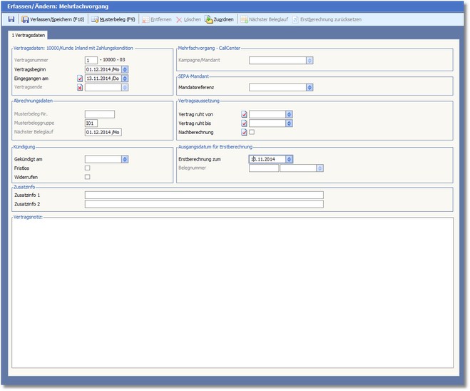 Mit der Funktionstaste [F10] schließen Sie den Dialog und speichern Ihre Eingaben. Das Programm kehrt zur vorgelagerten Auswahltabelle des Vertragscenters zurück.