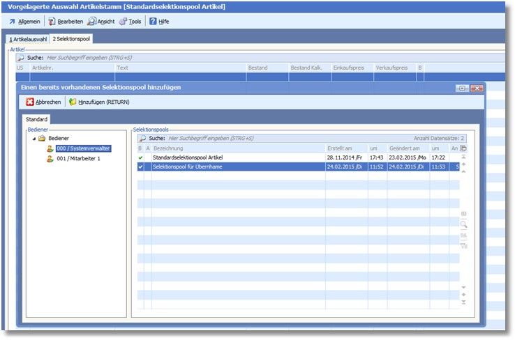 Abweichend von der Funktion Selektionspool übernehmen können über diese Funktion Inhalte eines anderen Selektionspools in den aktuellen Pool geholt werden, auch bedienerübergreifend.