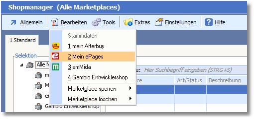 selektieren Sie in der Baumauswahl "Alle Marketplaces" und klicken Sie in der Menüleiste auf "Bearbeiten > (Shopname)".