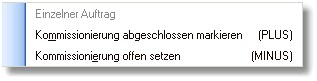 Mit [PLUS] bzw. [MINUS] auf dem in der Tabelle markierten Auftrag können Sie die Kommissionierung desselben als abgeschlossen bzw. nicht abgeschlossen markieren. Alternativ können Sie dieses Menü auch mit einem Klick auf den kleinen Pfeil rechts neben dem Button öffnen.