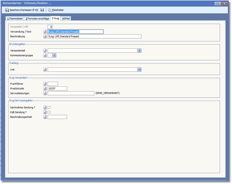 Der Bereich "VLog Versandart"